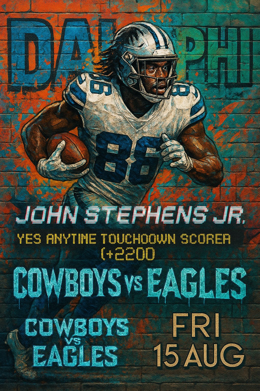 John Stephens Jr.s Anytime Touchdown Scorer prop at +2200 odds represents a highly unfavorable betting proposition, characterized by a severe negative edge of -42.5%. This assessment is rooted in his minimal offensive role and lack of production throughout his career. Stephens Jr. has registered zero touchdowns on only 12 career targets, a stark indicator of his limited involvement in the Dallas Cowboys passing game. His statistical efficiency is also notably low, with a meager 0.14 yards per route run in 2024, ranking him among the bottom-tier tight ends in the league. The game script projects the Dallas Cowboys as 7-point underdogs against the Philadelphia Eagles, with a low implied team total of just 19.8 points.