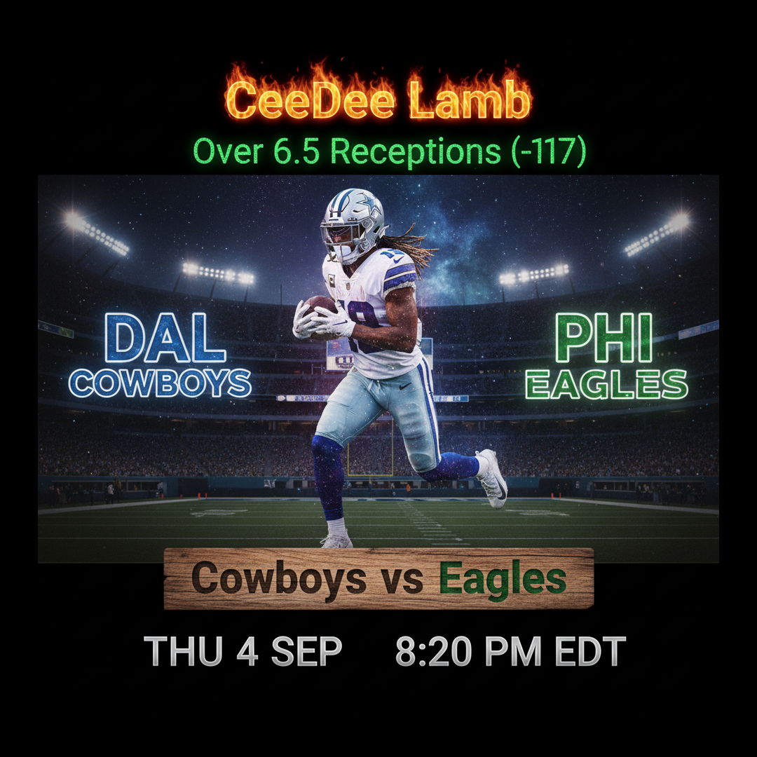 - 3.CeeDee Lamb Over 6.5 ReceptionsHigh target volume in a projected pass-heavy game script. DeepChamp AI provides expert analysis and detailed insights for these high-value NFL prop bets.