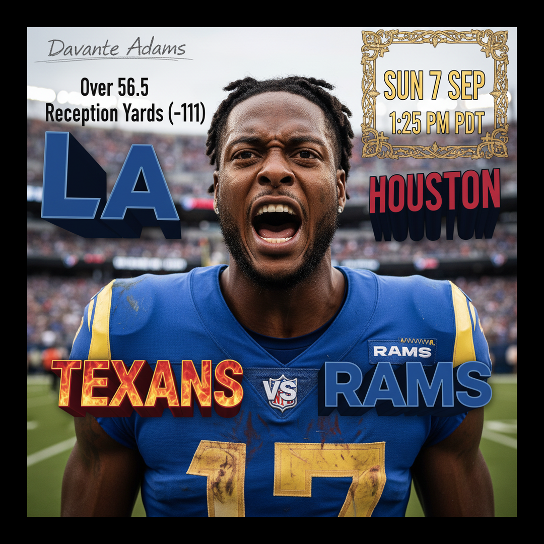 Davante Adams is set to make a significant impact in his Los Angeles Rams debut, and his reception yards prop presents a compelling opportunity. Adams has demonstrated remarkable consistency throughout his career, averaging 67.4 receiving yards per game over his last 32 appearances. His elite 68.2% career catch rate further underscores his reliability in securing targets and converting them into yardage. The matchup against the Houston Texans secondary is particularly advantageous.