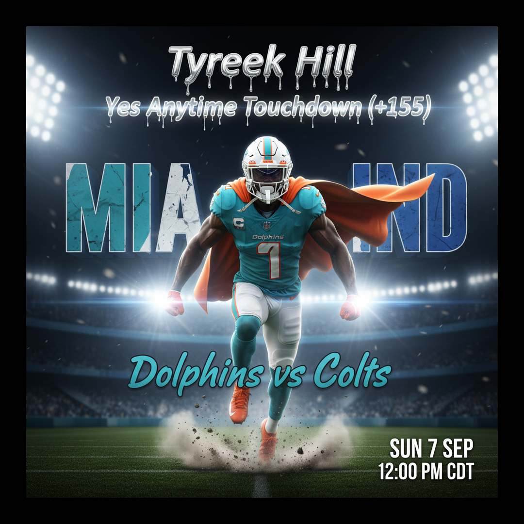 Tyreek Hill represents a significant value proposition on his Anytime Touchdown prop, primarily due to a substantial discrepancy between his historical scoring rate and the current odds. Last season, Hill was a touchdown-scoring machine, registering 12 touchdowns in just 17 games, translating to a per-game probability of 70.6%. This remarkable efficiency is the bedrock of this bet. The current odds of +155 for an Anytime Touchdown imply a probability of only 39.2%. When comparing this to his historical rate, it reveals an astounding mathematical edge of 80.1%.